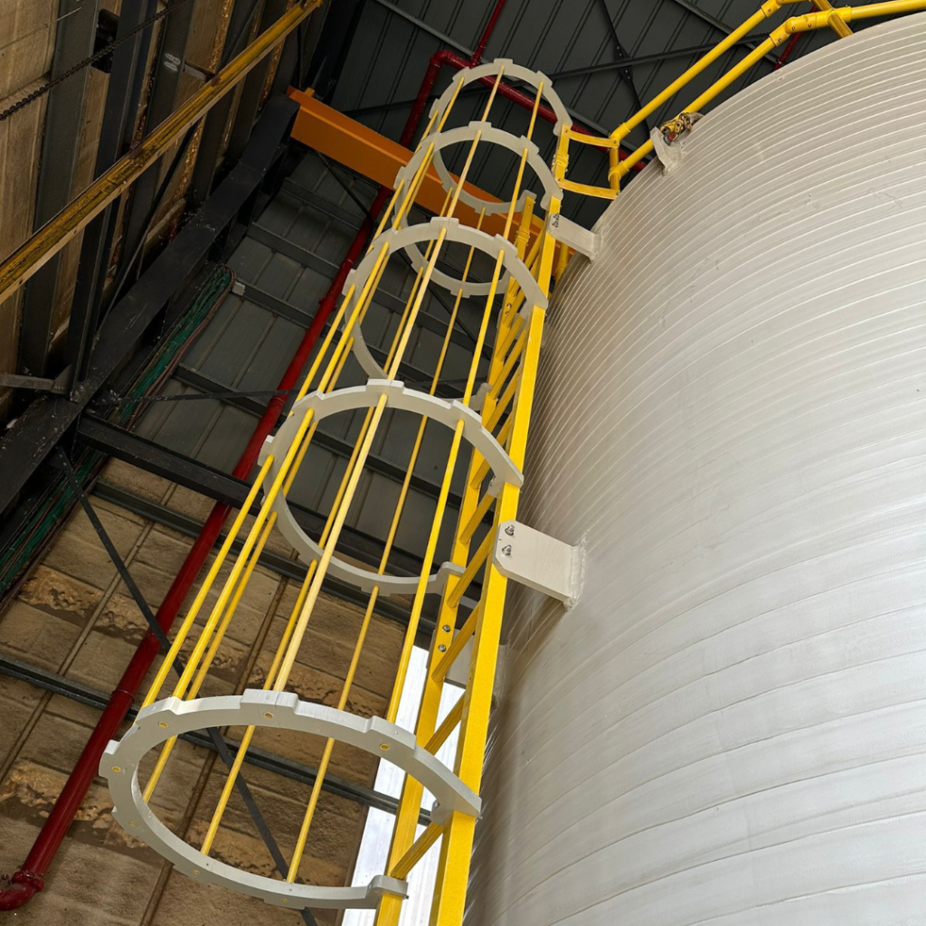 ייצור סולמות עם כלוב הגנה מפיברגלס, תוצרת כחול לבן על פי תו תקן ISO
