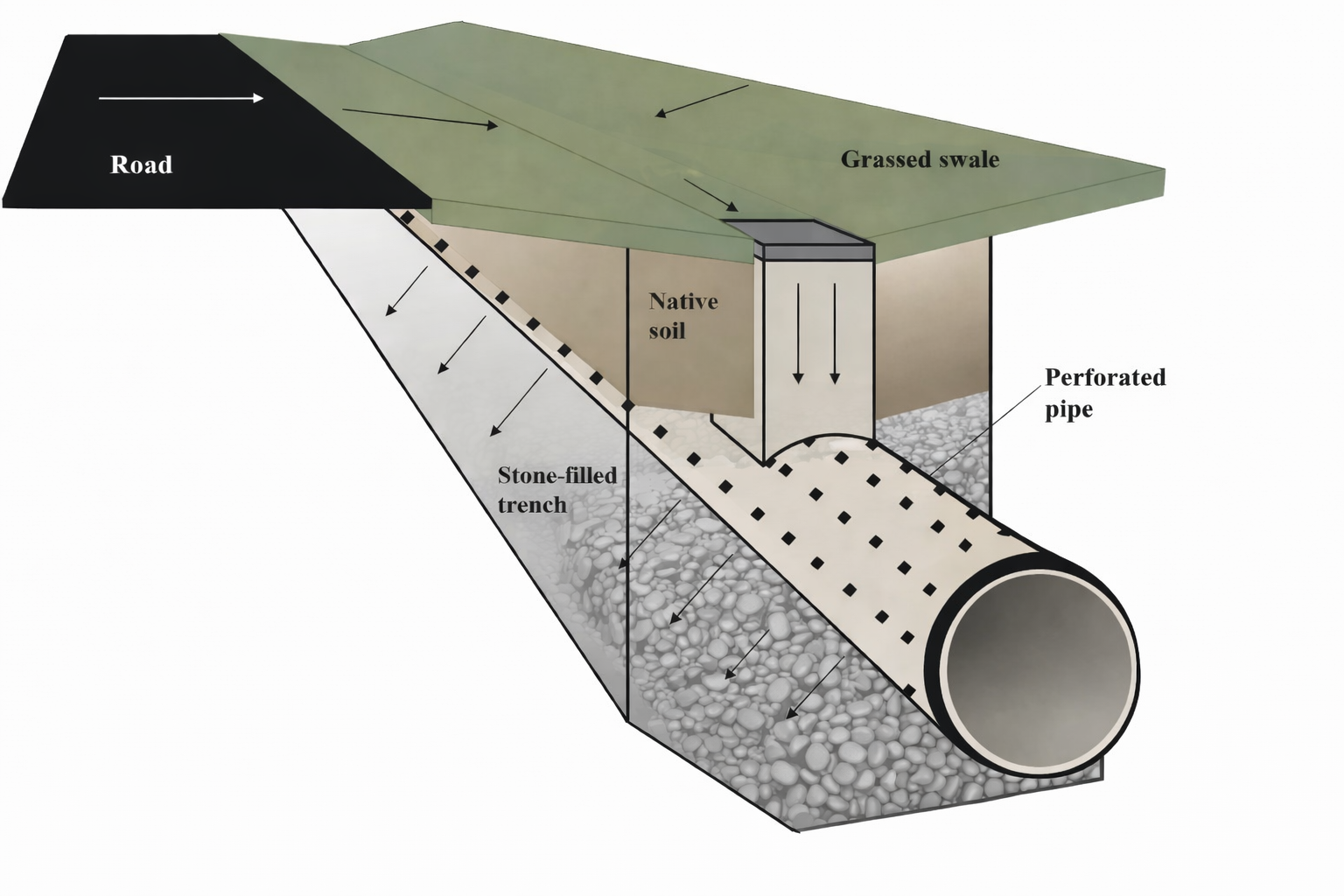 צינורות מחורצים בשני שלישים מהיקפם (LP)צינורות המותקנים על גבי מצע משופע, ומיועדים לקליטת מי חלחול, מים תת-קרקעיים ומי נגר עילי דרך החריצים העליונים. |